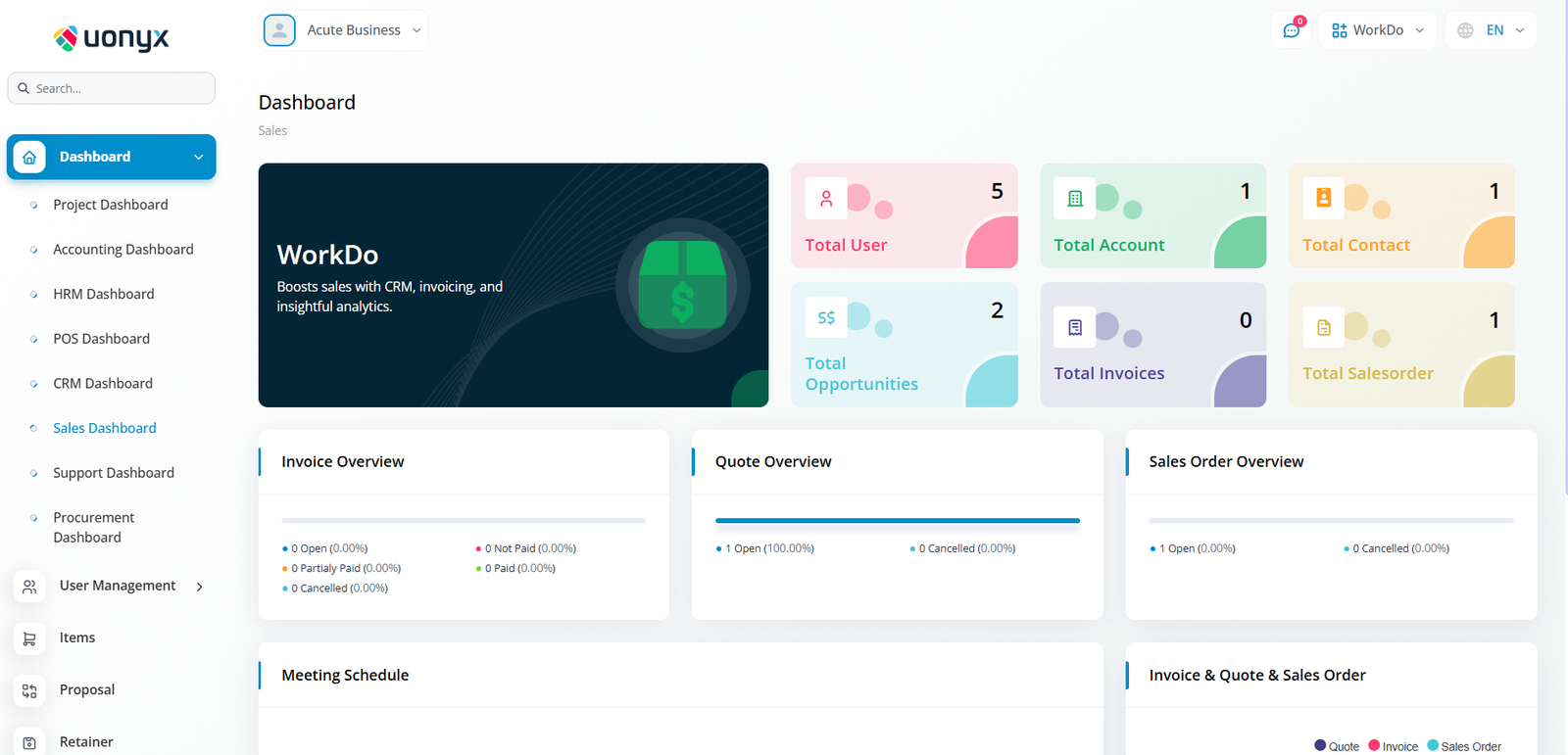You can also find the individual overview of each of these elements broken down in percentages with their respective status. Additionally, know the top due tasks, meeting schedule, and monthly calls on this dashboard.