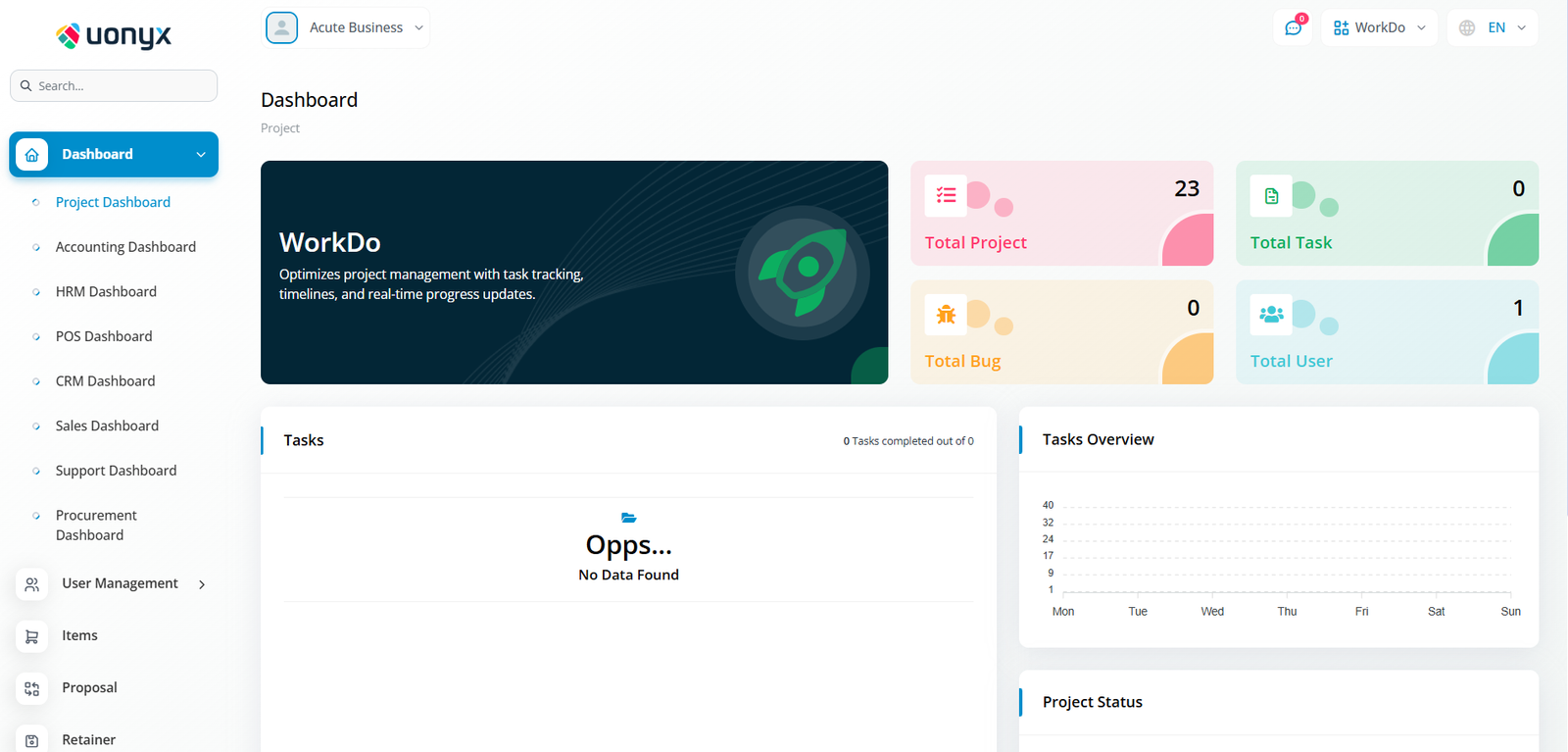 Get an overview of the total number of projects, tasks, bugs, and members. A visual representation of the task overview and project status can help you estimate the progress on each task. Lastly, you can check the top due task.