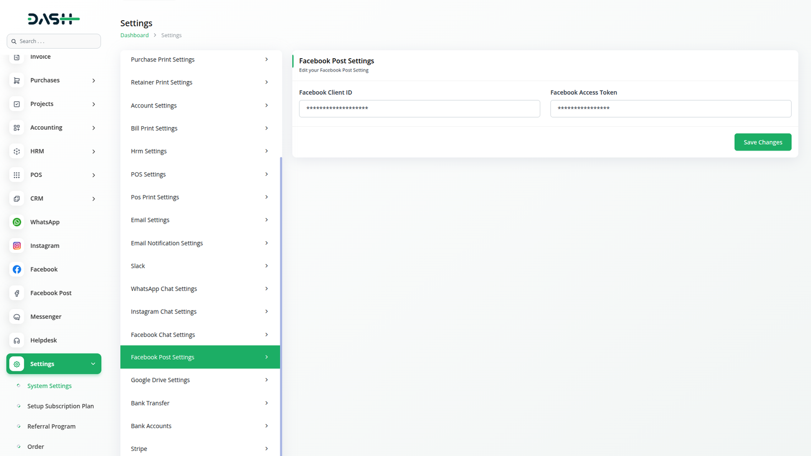 To start using the Facebook Post Add-on, you first need to configure your Facebook credentials. Navigate to the System Settings page and enter your Facebook Client ID and Facebook Access Token. These credentials establish a secure connection between Dawamk SaaS and Facebook, allowing posts to be published without any manual effort. Once configured, you’re ready to create and manage posts directly from the platform.