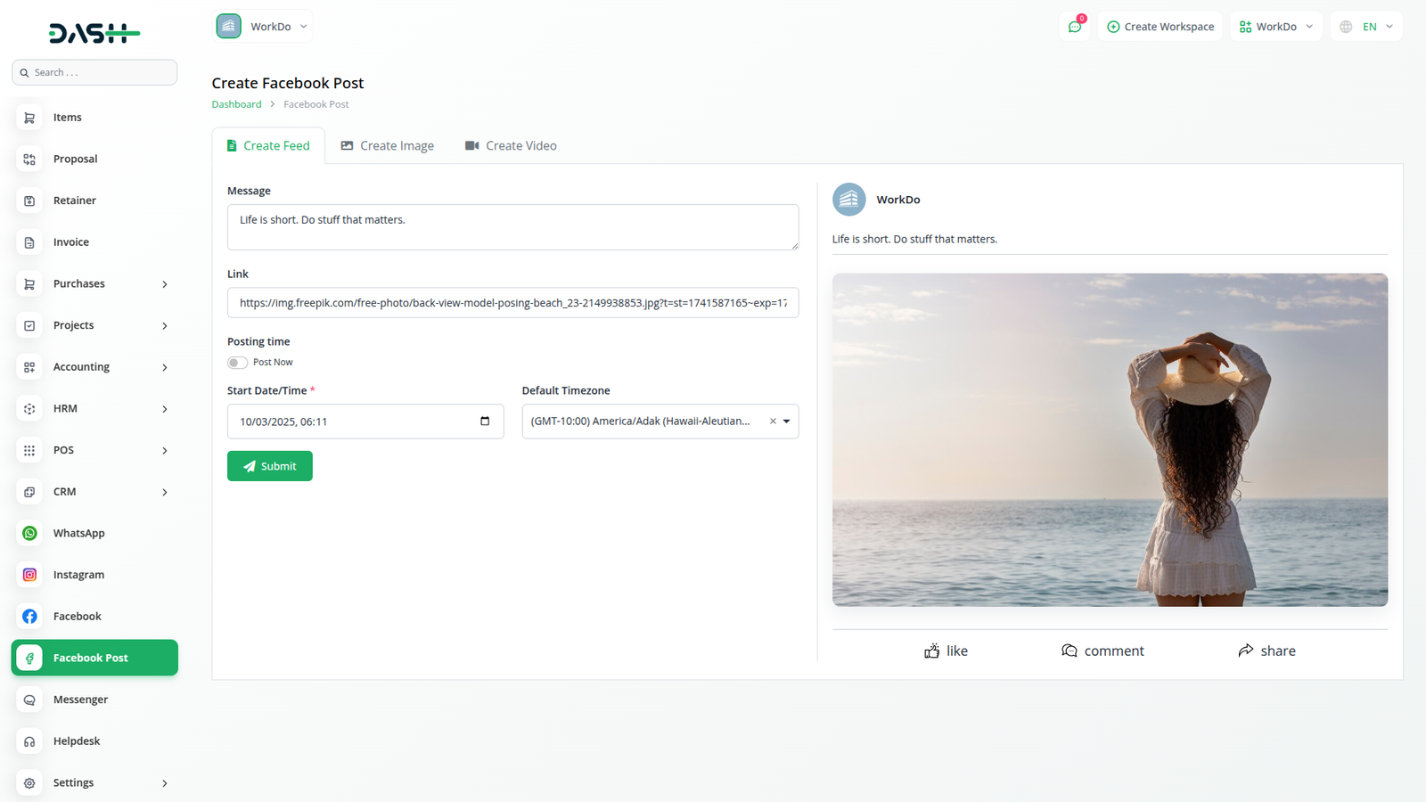 Once the setup is complete, head over to the Facebook Post page within Dawamk SaaS. Here, you can compose a new post, upload images or videos, and add captions. You can upload images either by providing a link or selecting a file from your system. If you want to schedule a post for later, simply set the desired time and timezone, and the system will automatically publish it at the chosen time. If you prefer to post immediately, just hit publish, and it will go live on your Facebook account instantly.