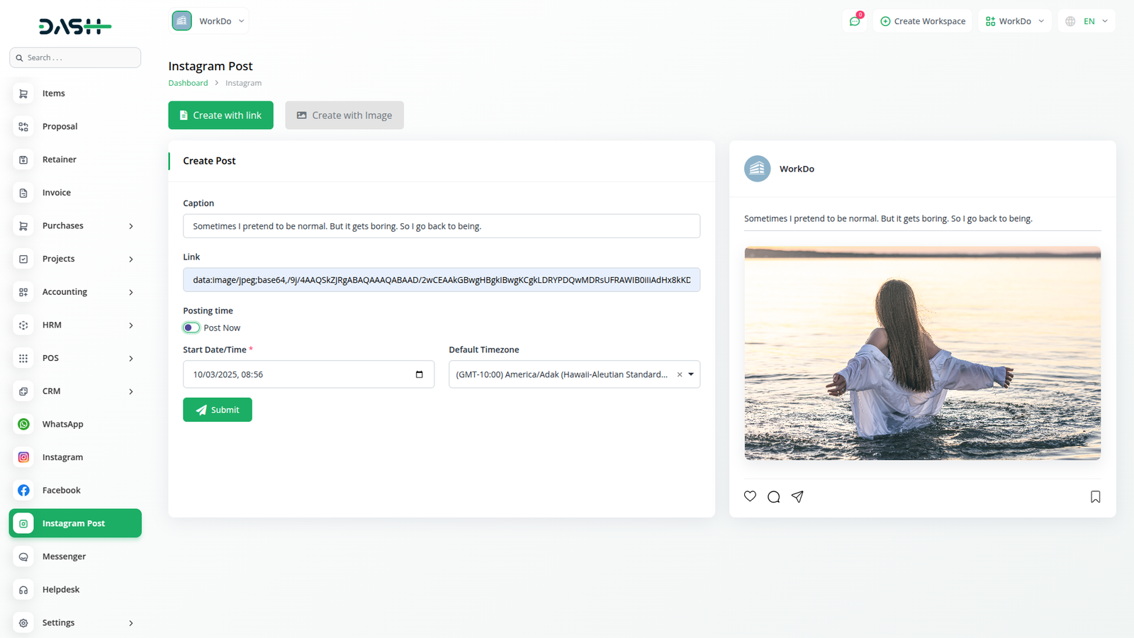 With the Dawamk SaaS Instagram Add-on, posting content is quicker and easier than ever. You can create posts directly from the portal and publish them on your Instagram account instantly or schedule them for a later time. This scheduling feature ensures that your content goes live at the perfect moment, even if you`re busy or unavailable. Whether you prefer to upload images from your files or generate them via a link, the flexibility ensures that your workflow remains smooth and convenient. The intuitive interface allows you to draft captions, format your content, and preview posts before publishing. By reducing the number of steps involved in posting, this add-on saves time while ensuring consistency in your content strategy, making it an essential tool for businesses and influencers alike.